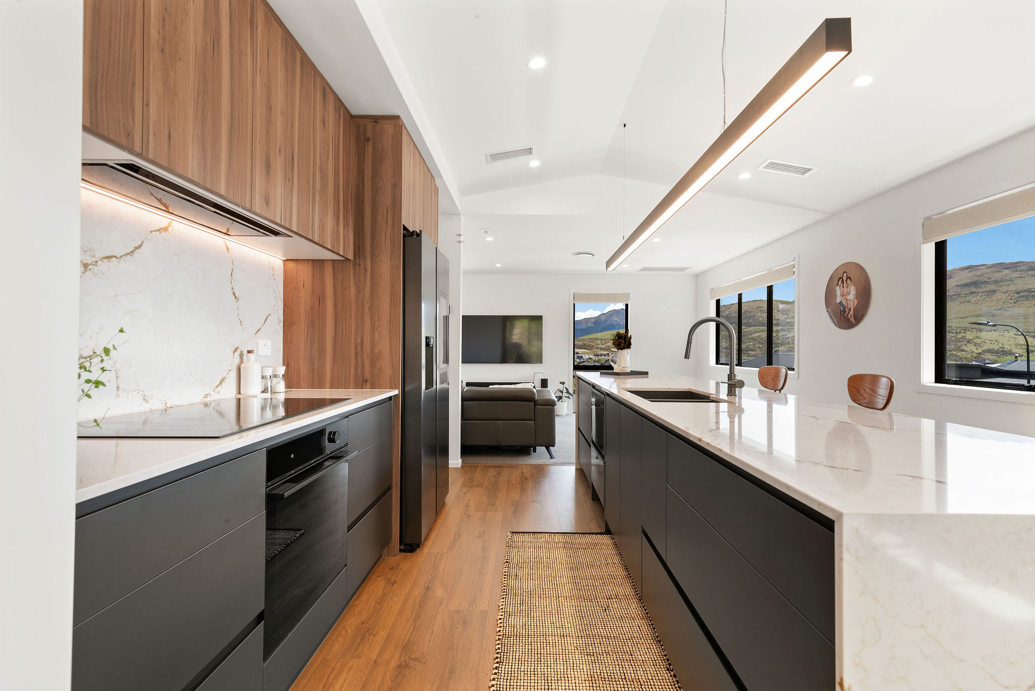 Open-plan living with high ceilings enhances the sense of space, flowing seamlessly from the kitchen out to the expansive outdoor deck. The kitchen is a true centrepiece of the home, featuring a striking extra length stone waterfall island bar, ideal for hosting friends and family. A generous walk-in pantry provides excellent storage.