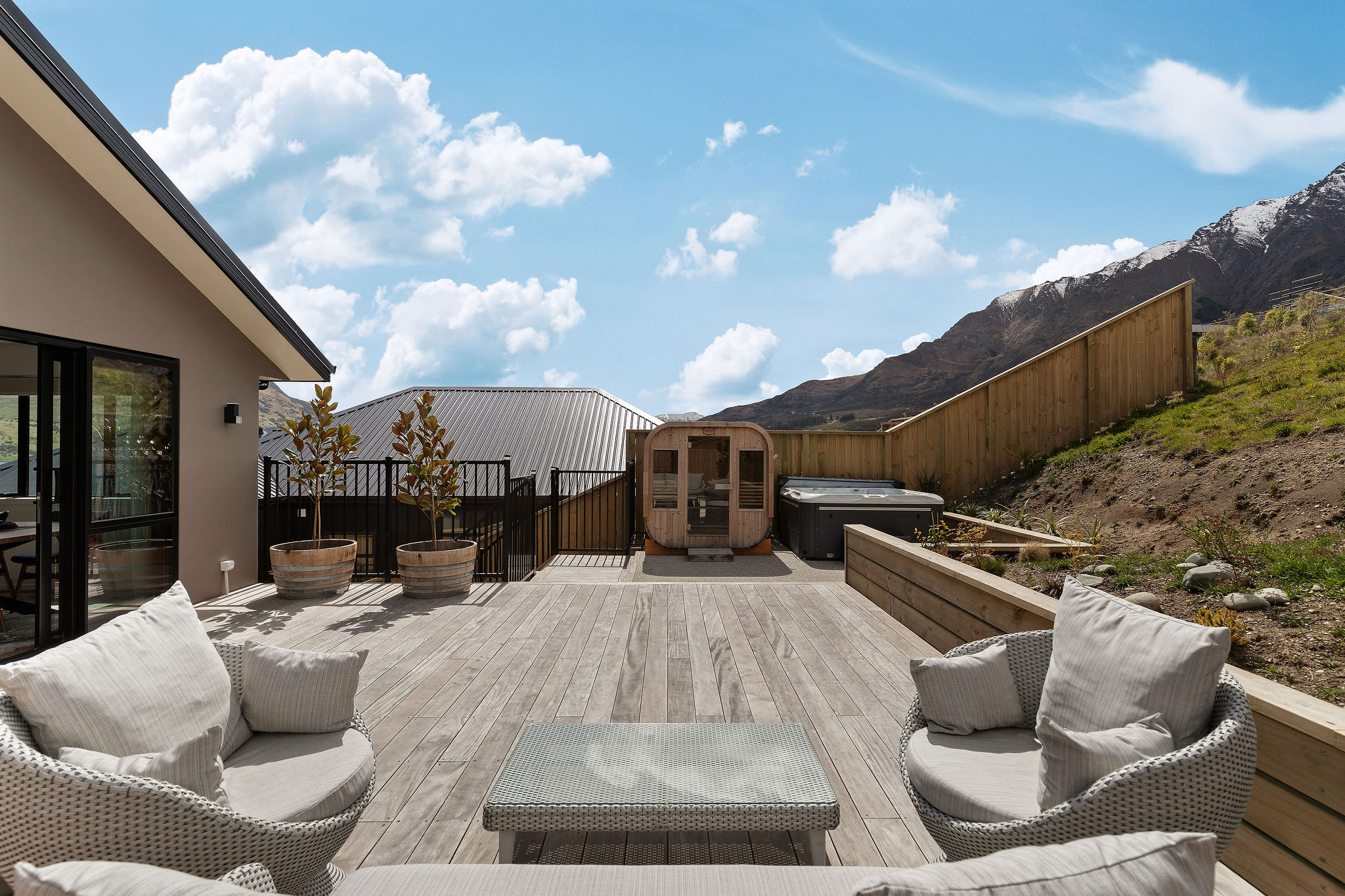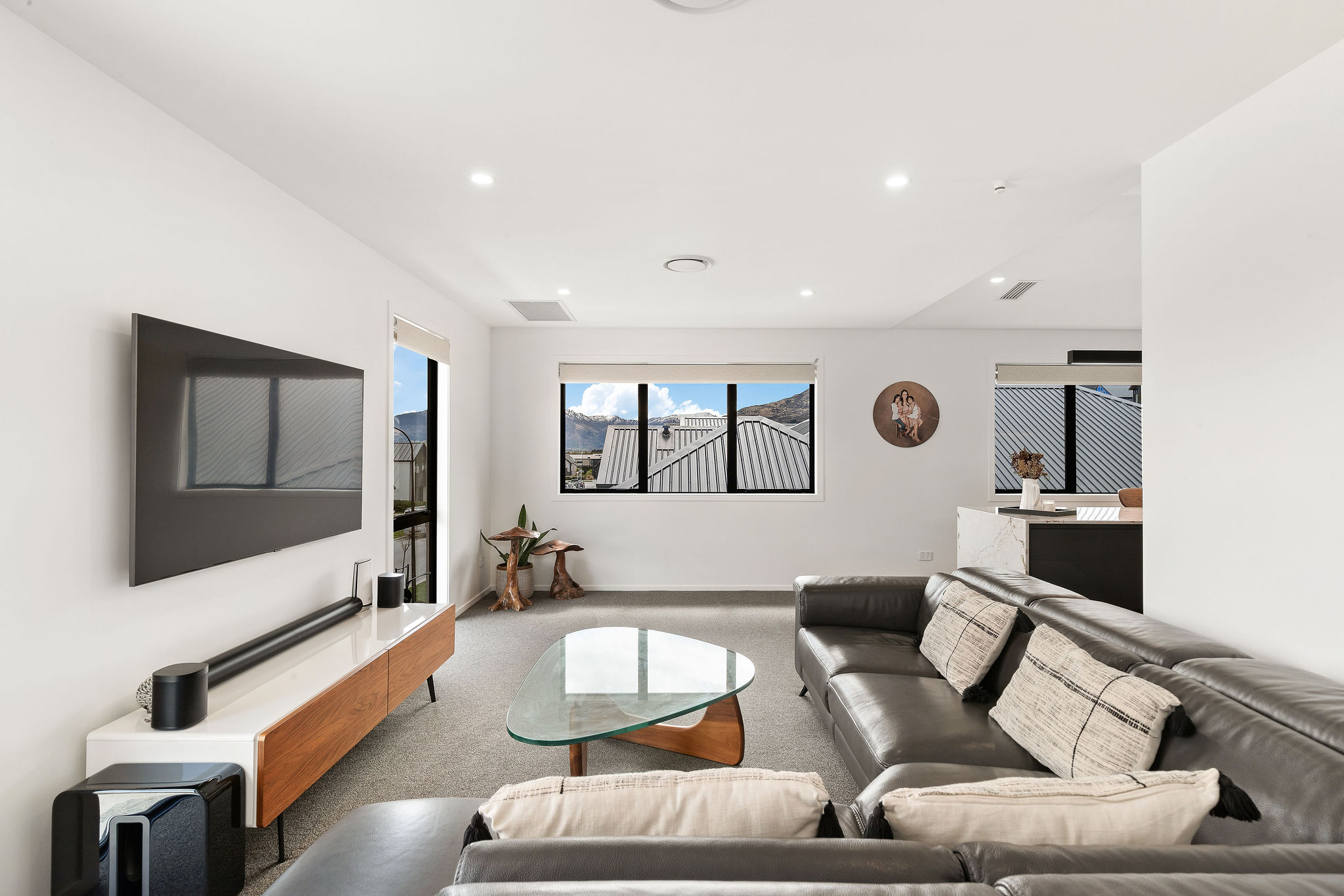 A custom-built bar adds a social element to the living space. Grab a drink on your way to the spa after a long day on the slopes while taking in uninterrupted views of Coronet Peak, The Remarkables and Cecil Peak.